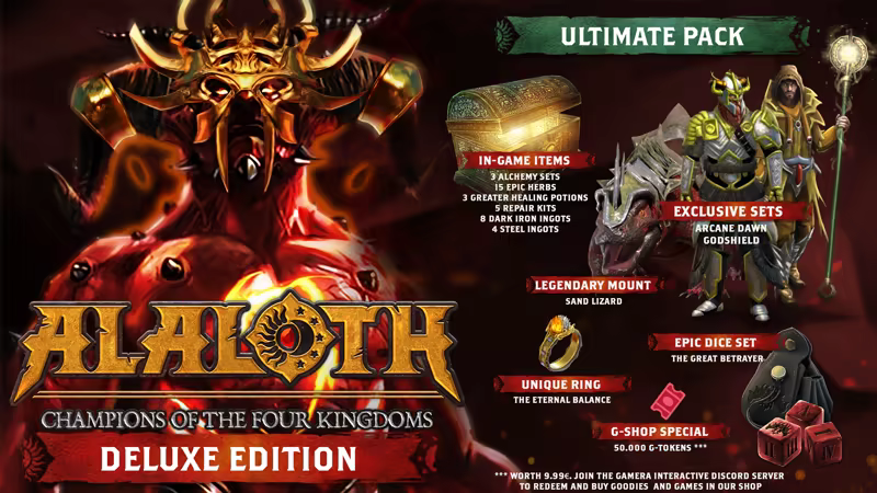 The Ultimate Pack with two unique sets [Godshield and Arcane Dawn] a unique dice set [The Great Betrayer] a legendary mount [Sand Lizard], a unique ring [The Eternal Balance], in-game goodies [epic herbs, ingots, potions, repair kits, alchemy sets] and 50.000 G-Tokens to be redeemed on Gamera Interactive Discord server to buy goodies and games from our catalogue [worth 9.99$]